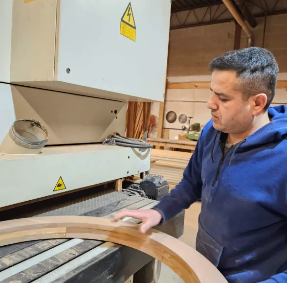 Our craftsmen shape each part of the door with precision, including the frame and panels. All pieces are carefully assembled to ensure a perfect fit and strong structure. The surface is then sanded multiple times to create a smooth, clean finish, ready for staining.
